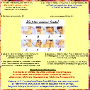 A la fin des ablutions, il est recommandé de dire :(Ach-hadou an laa ilaha illa Allah wa achhadou anna Mohammadane abdouhou wa rassoulouhou. Allahoumma idjalnii min at-tawaabiin wadj‘alni min al-moutatahhirin.Subhaanaka Allahoumma wa bihamdika. Achhadou an laa ilaha illa Anta. Astaghfirouka wa atoubou ilayka.)